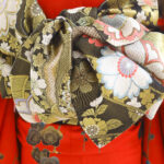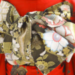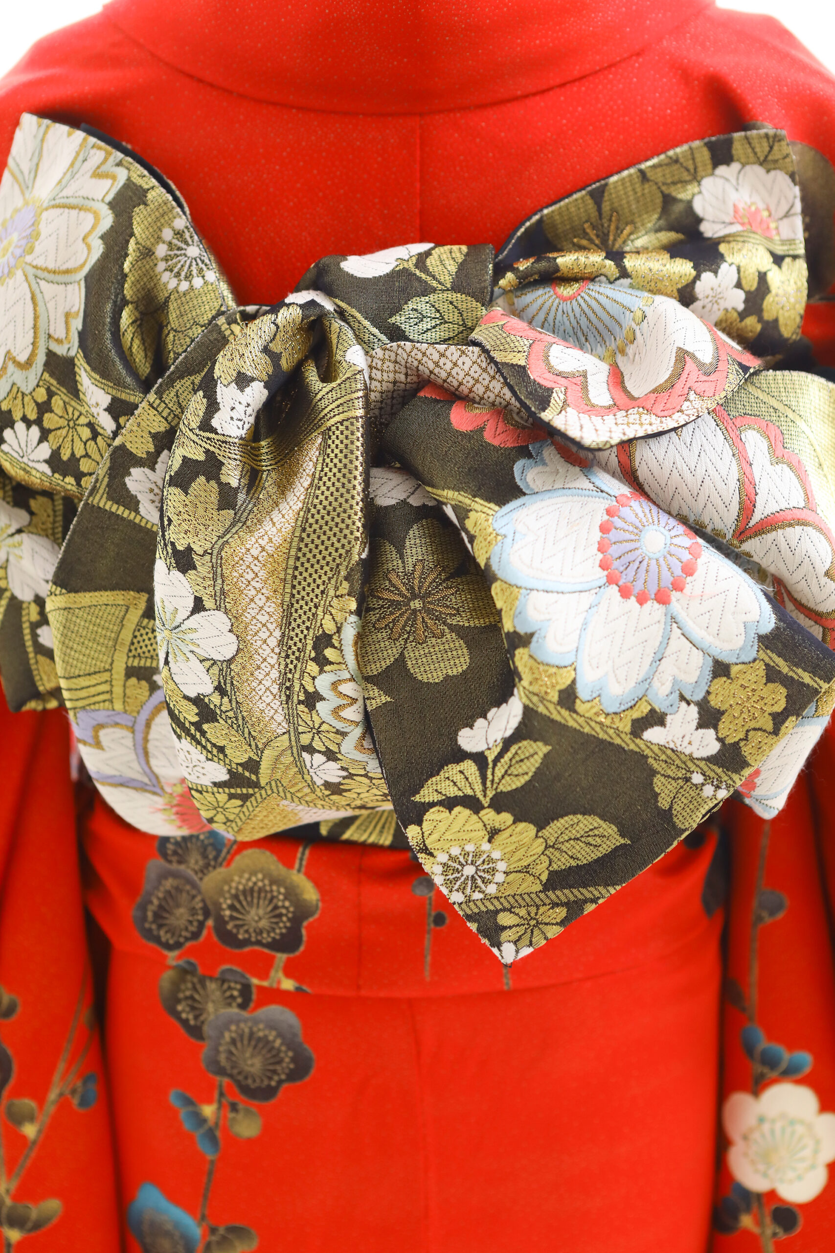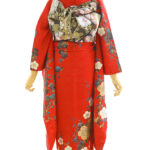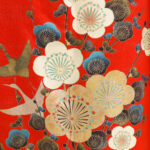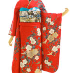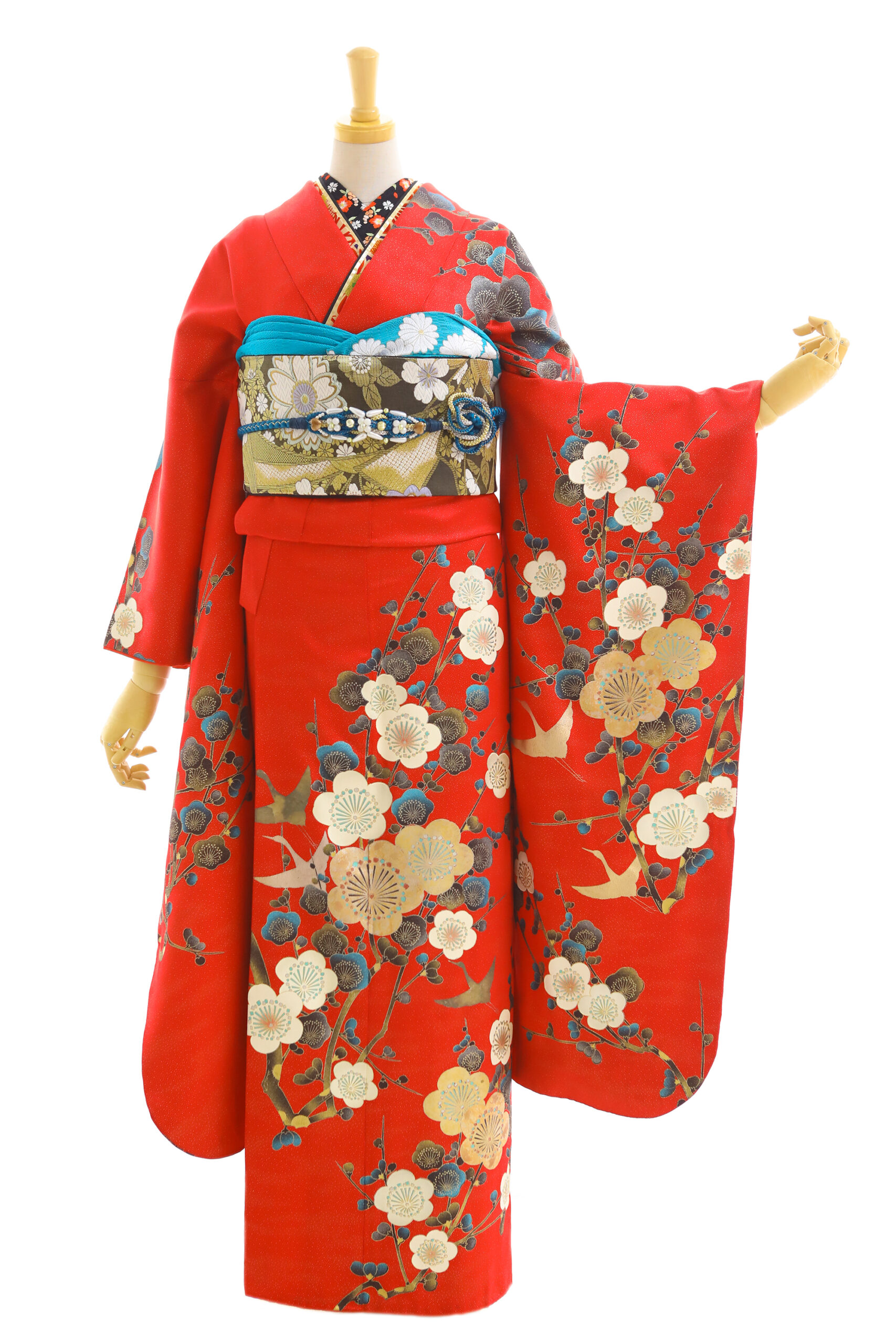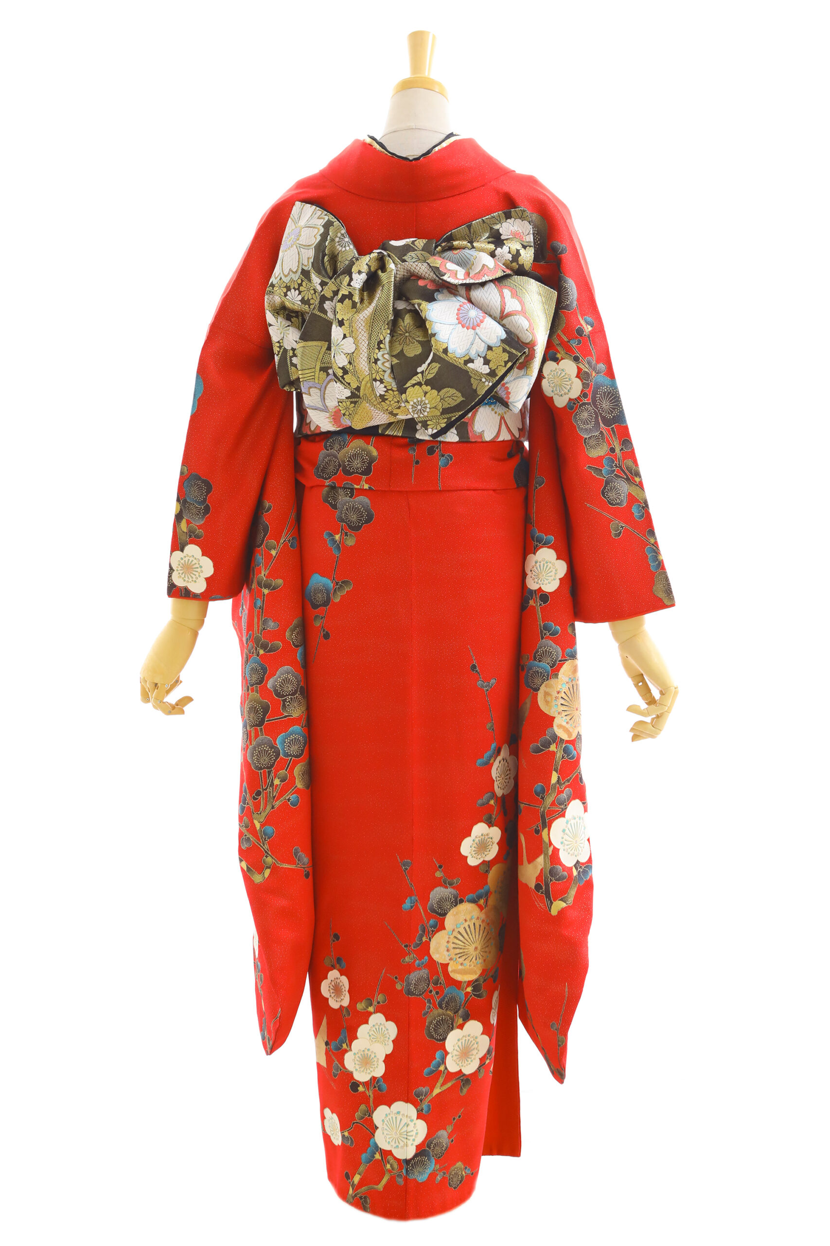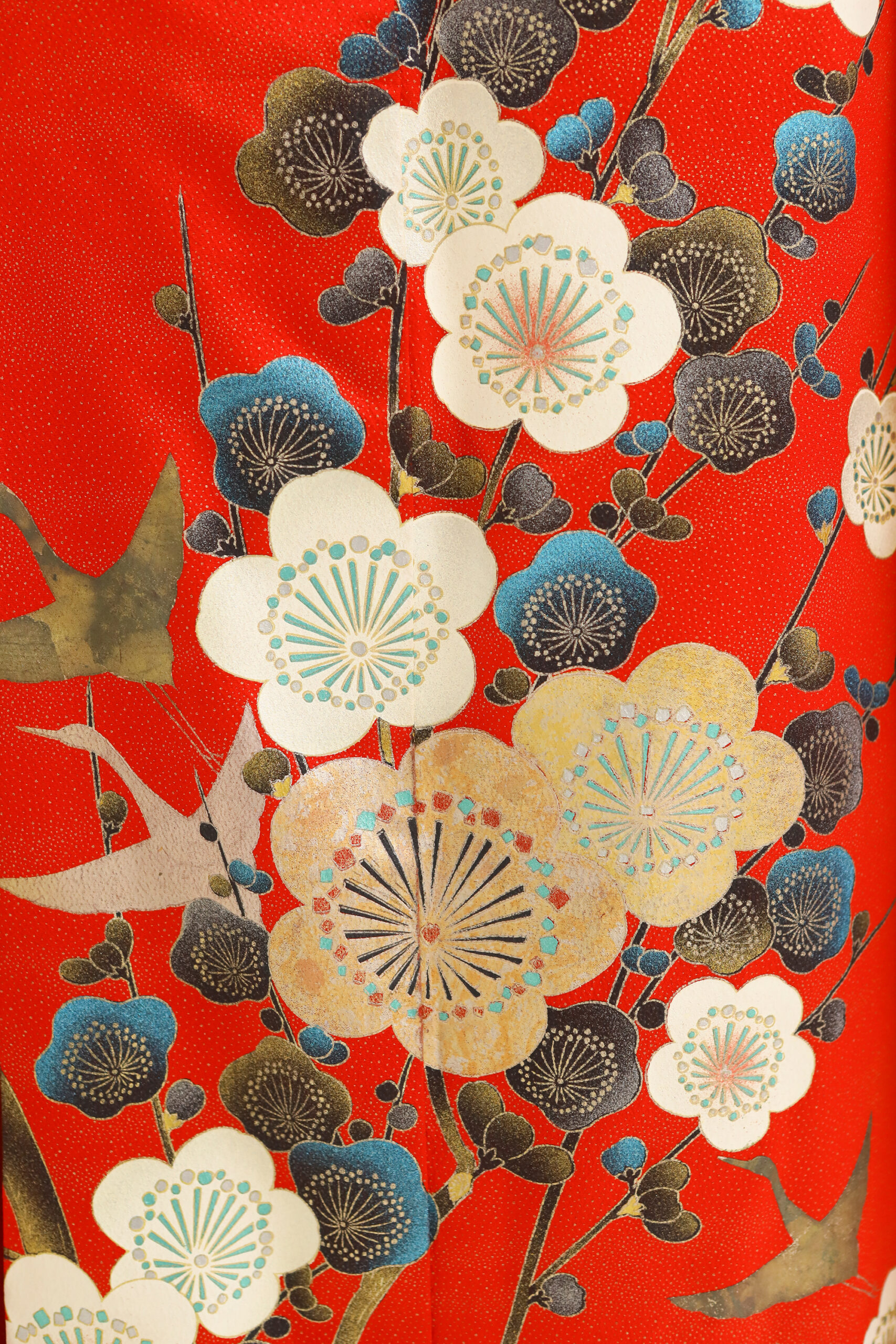 艶めく朱色が鮮やか。梅や鶴の柄がおめでたいお祝いの席にぴったりな一着。