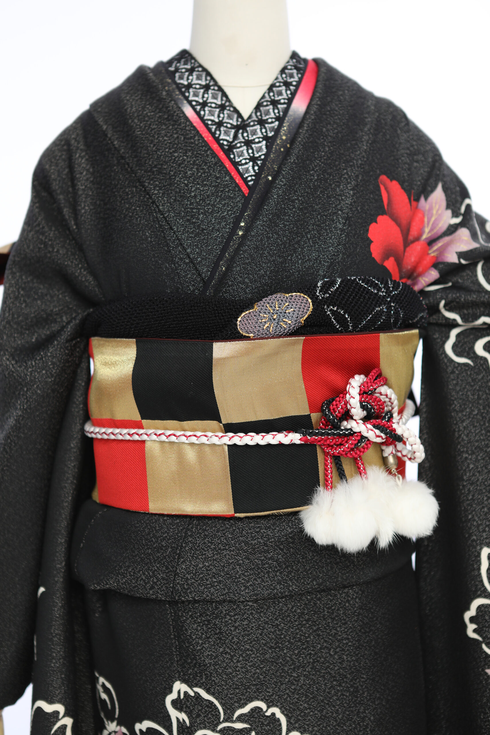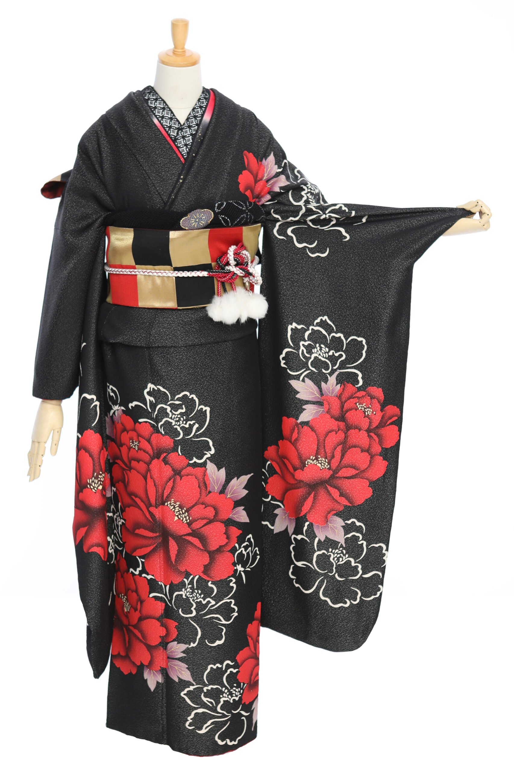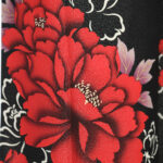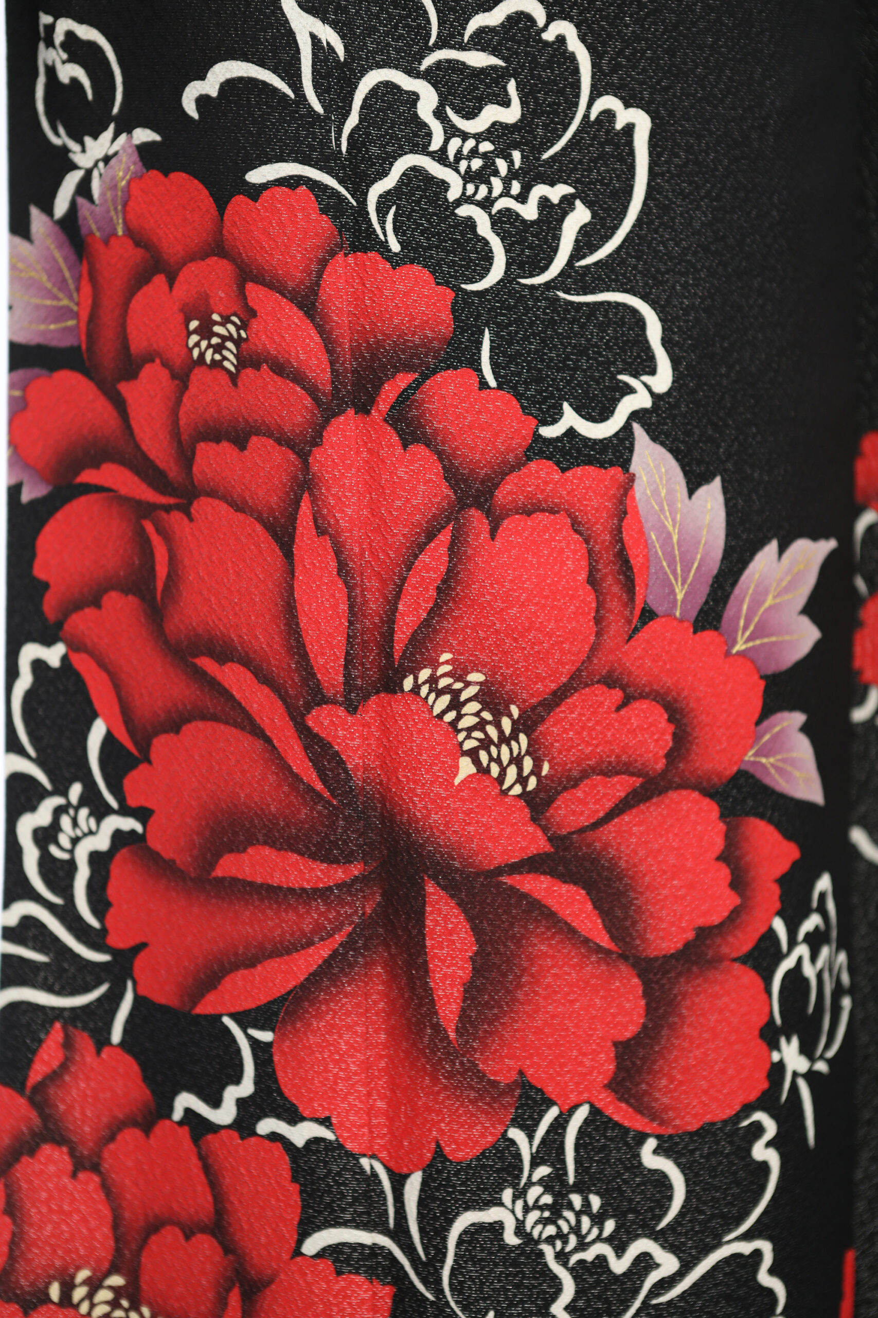 鮮やかな赤い大牡丹。黒×赤でキリッと引き締まるカラー。カッコよく尖って目立てるデザインです。
