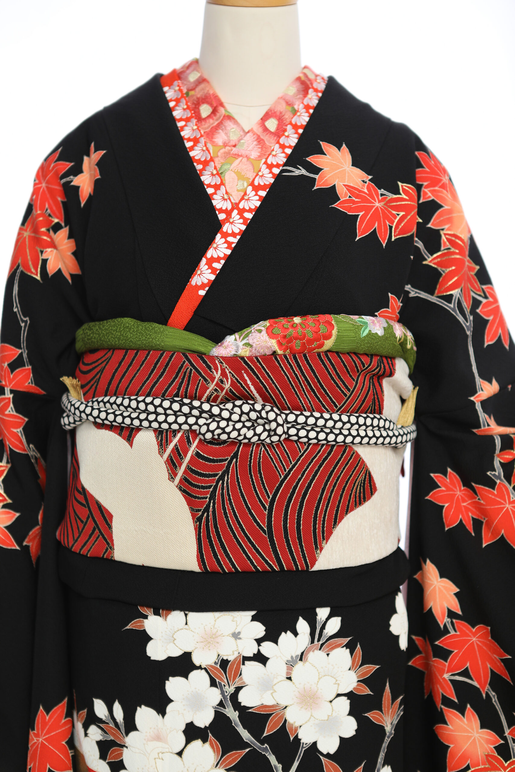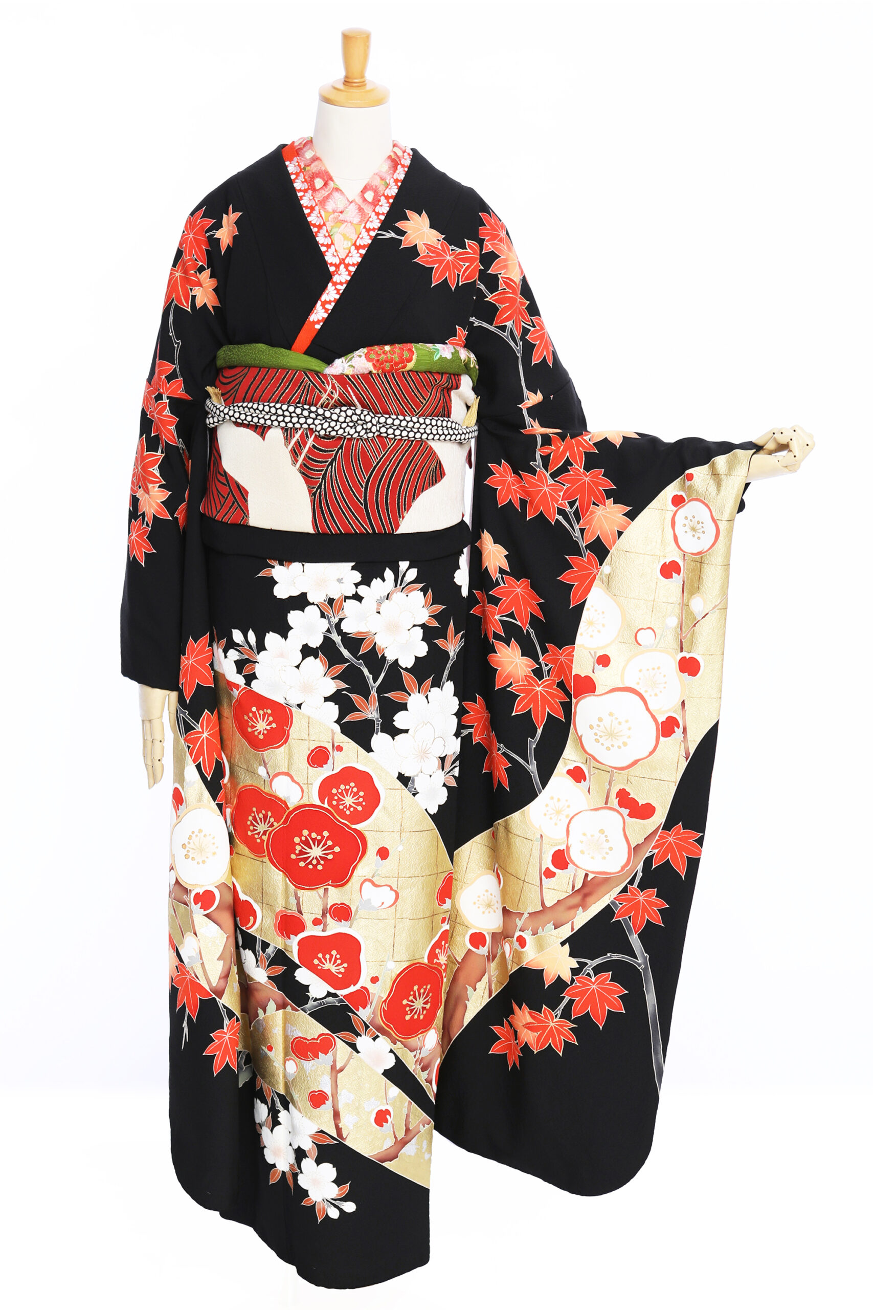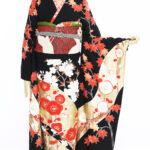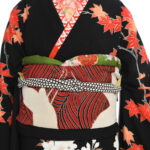 スッキリ見える黒地に赤、白、金色のカラーリングで色を絞り上品に仕上げています。紅葉や桜が縦に伸びるように描かれて、スタイルアップも叶います。