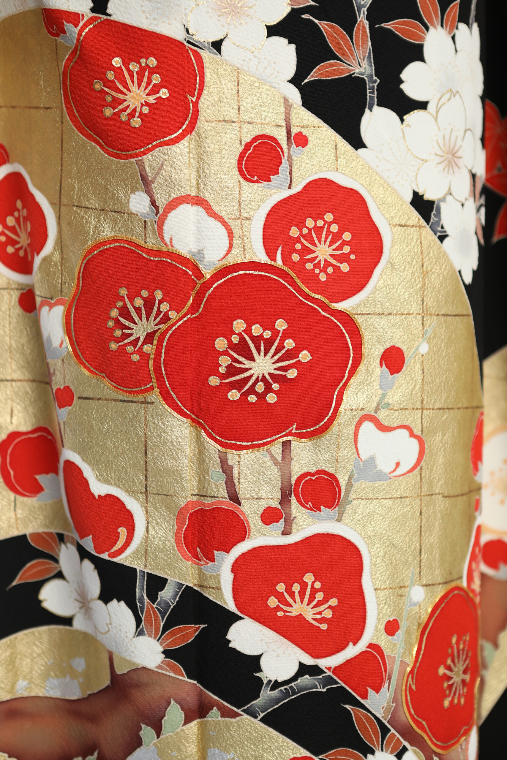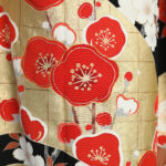 生地は緞子で重厚感もあり、大きく流れる金箔には、紅梅白梅の友禅が華やかに描かれ、幅広い世代に好まれるデザインです。