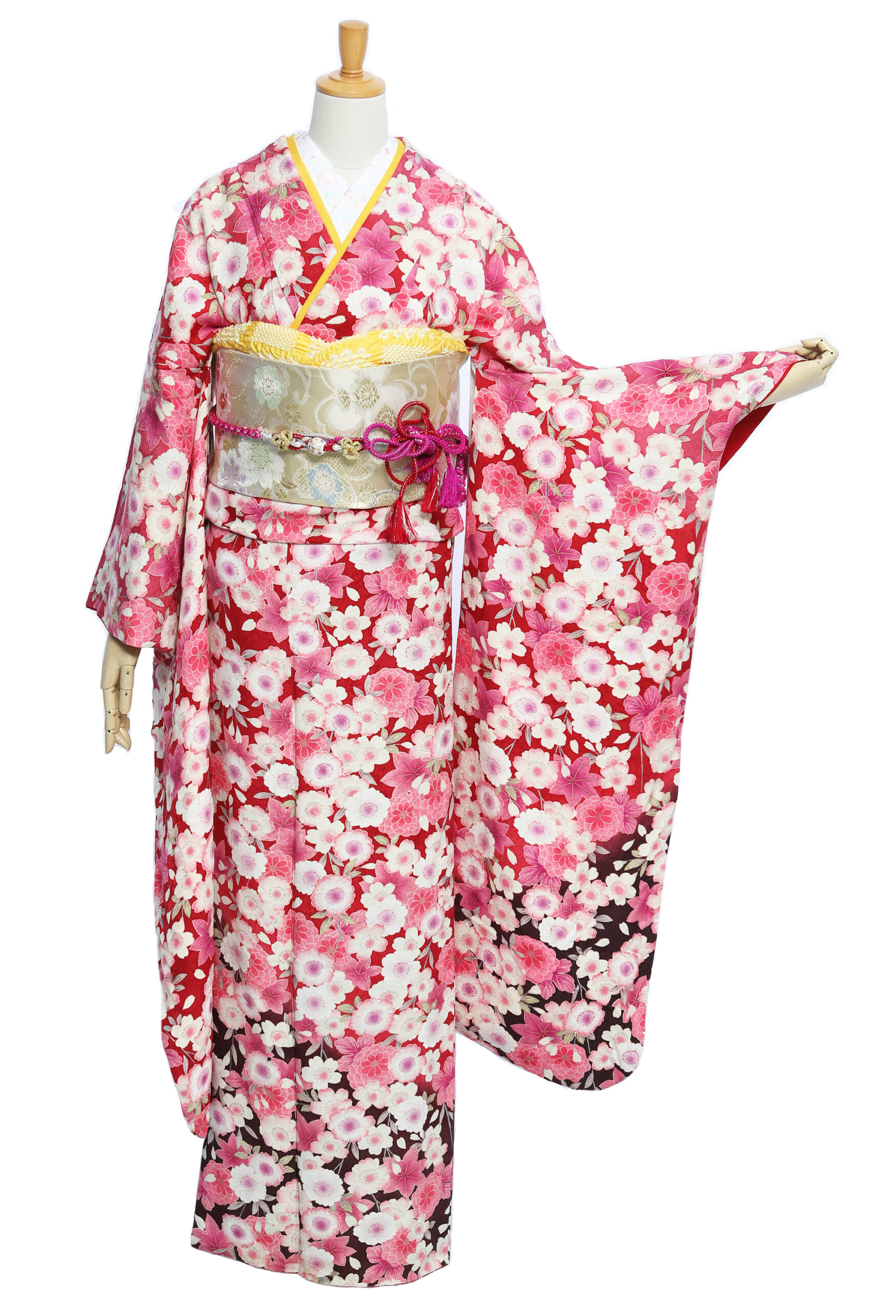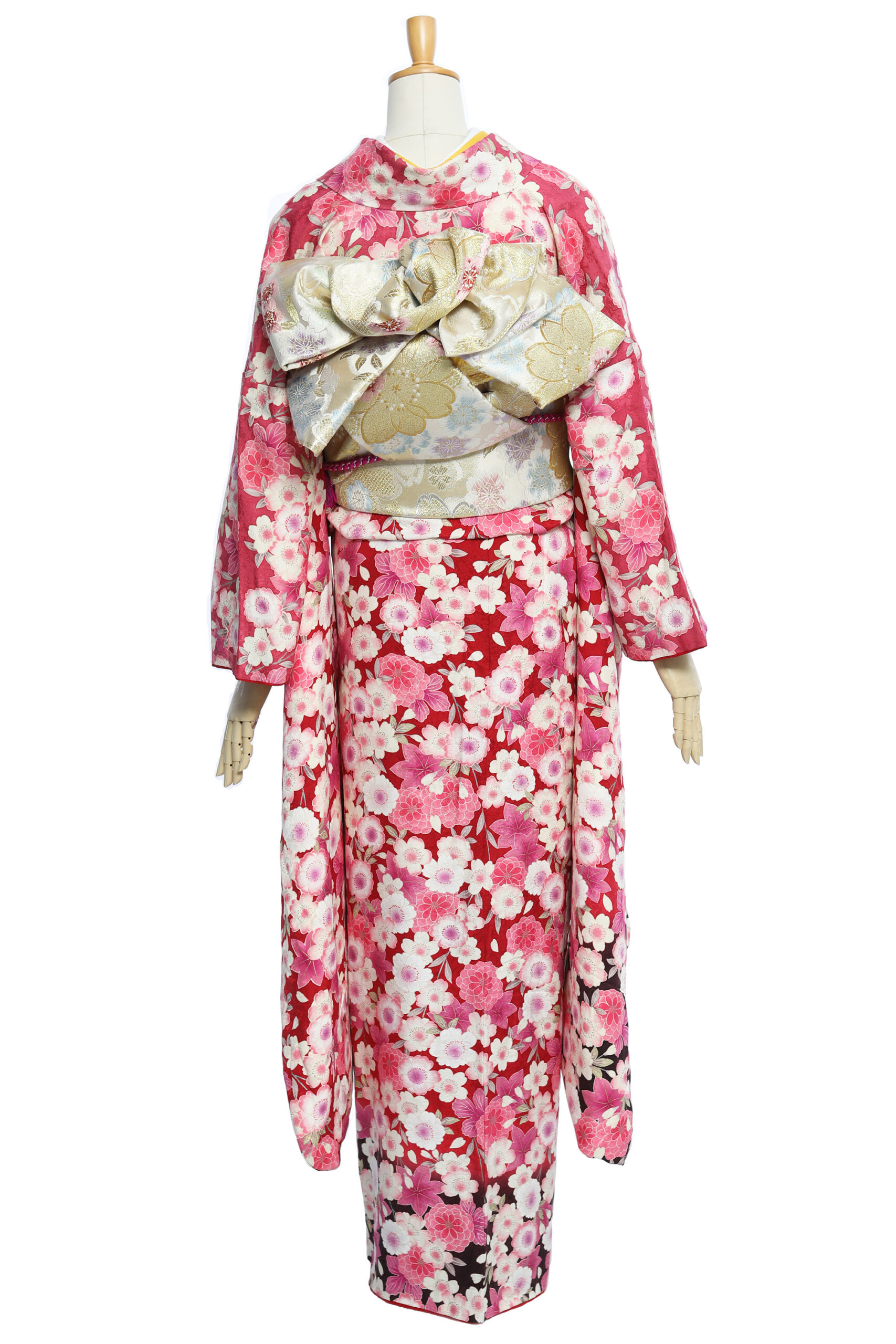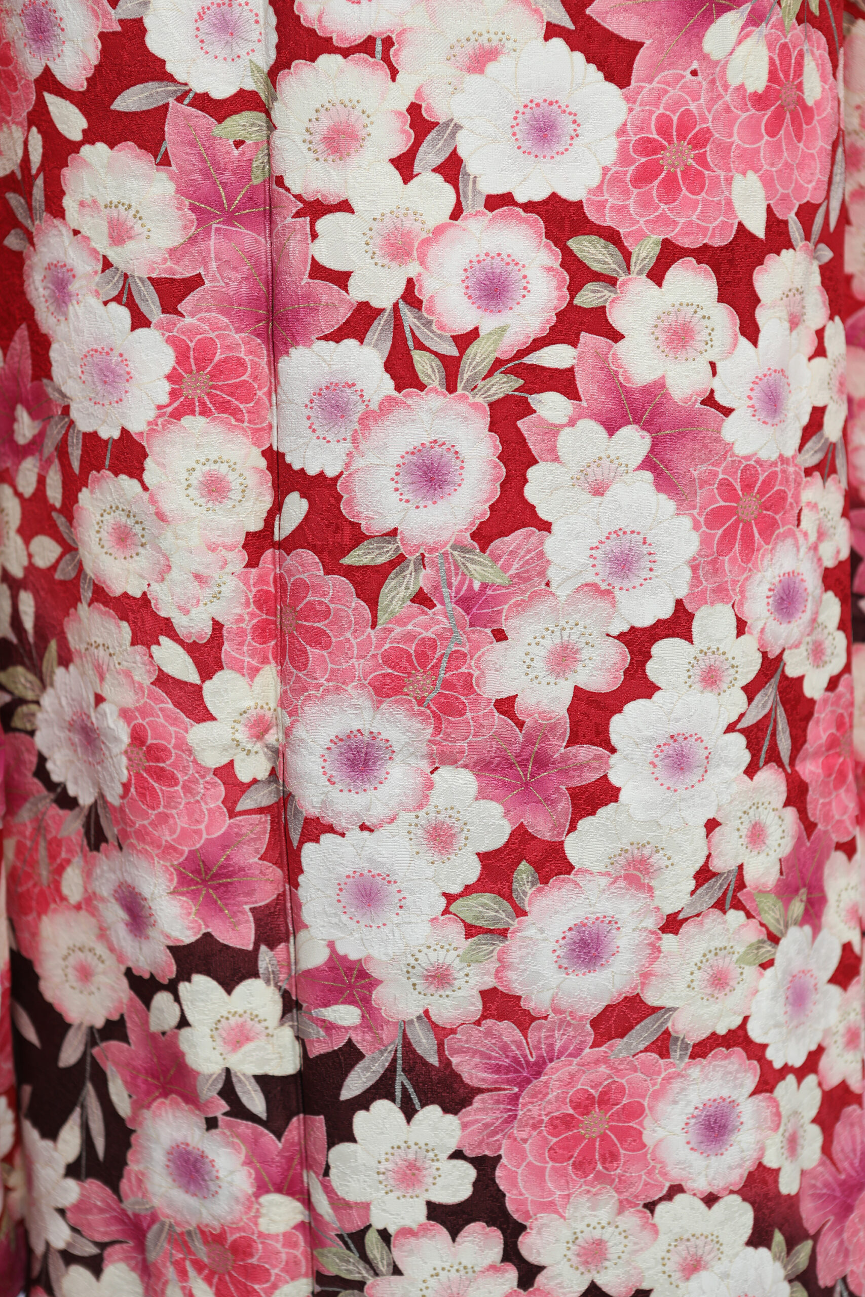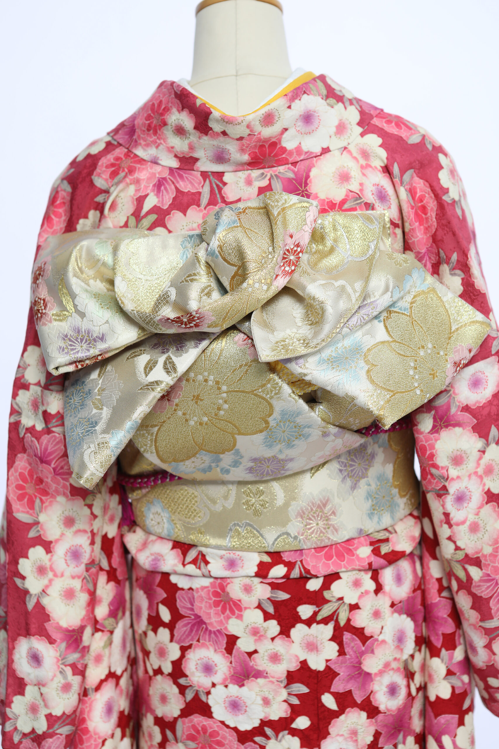 赤地の地色に、桜、桃、菊を惜しみなく描いた数少ない総柄タイプの逸品振袖です。