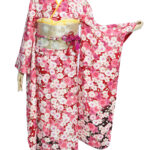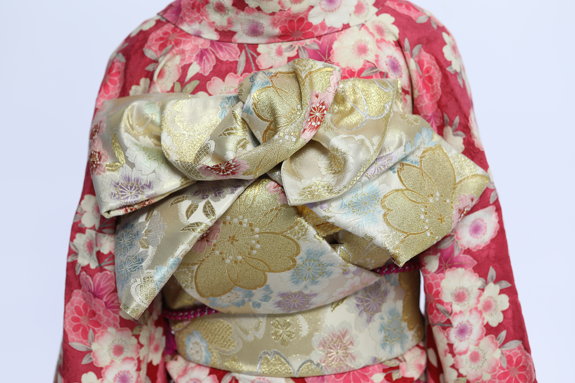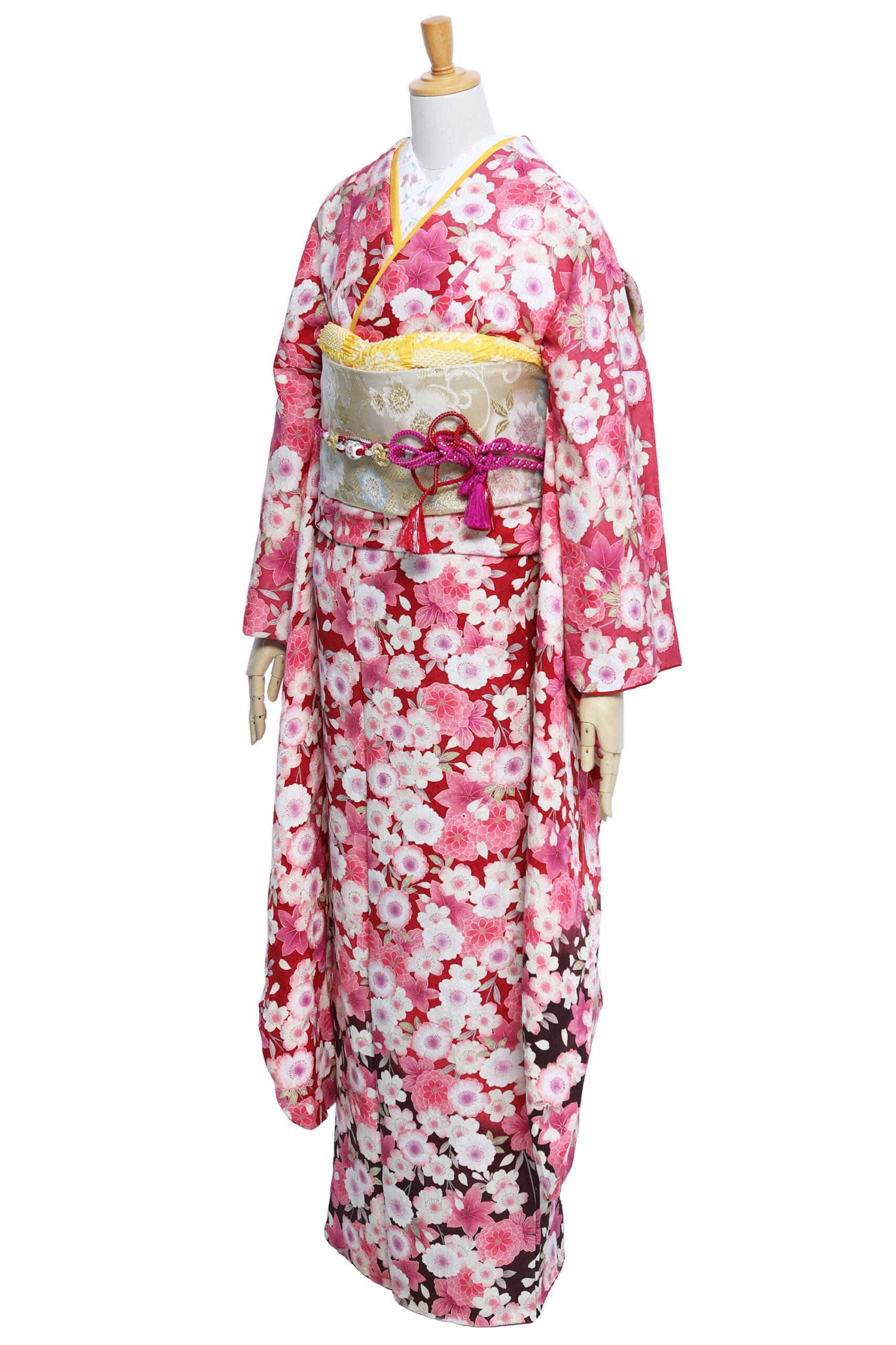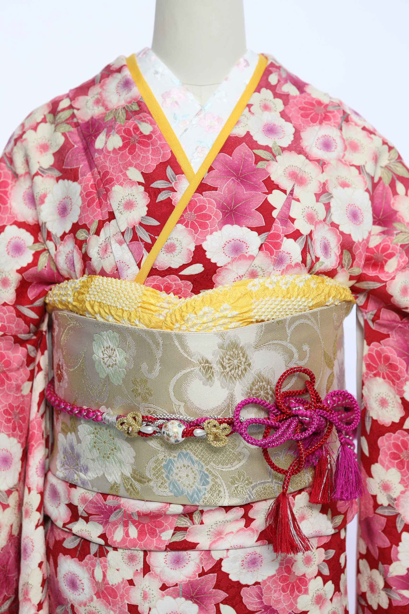 赤地の地色に、桜、桃、菊を惜しみなく描いた数少ない総柄タイプの逸品振袖です。