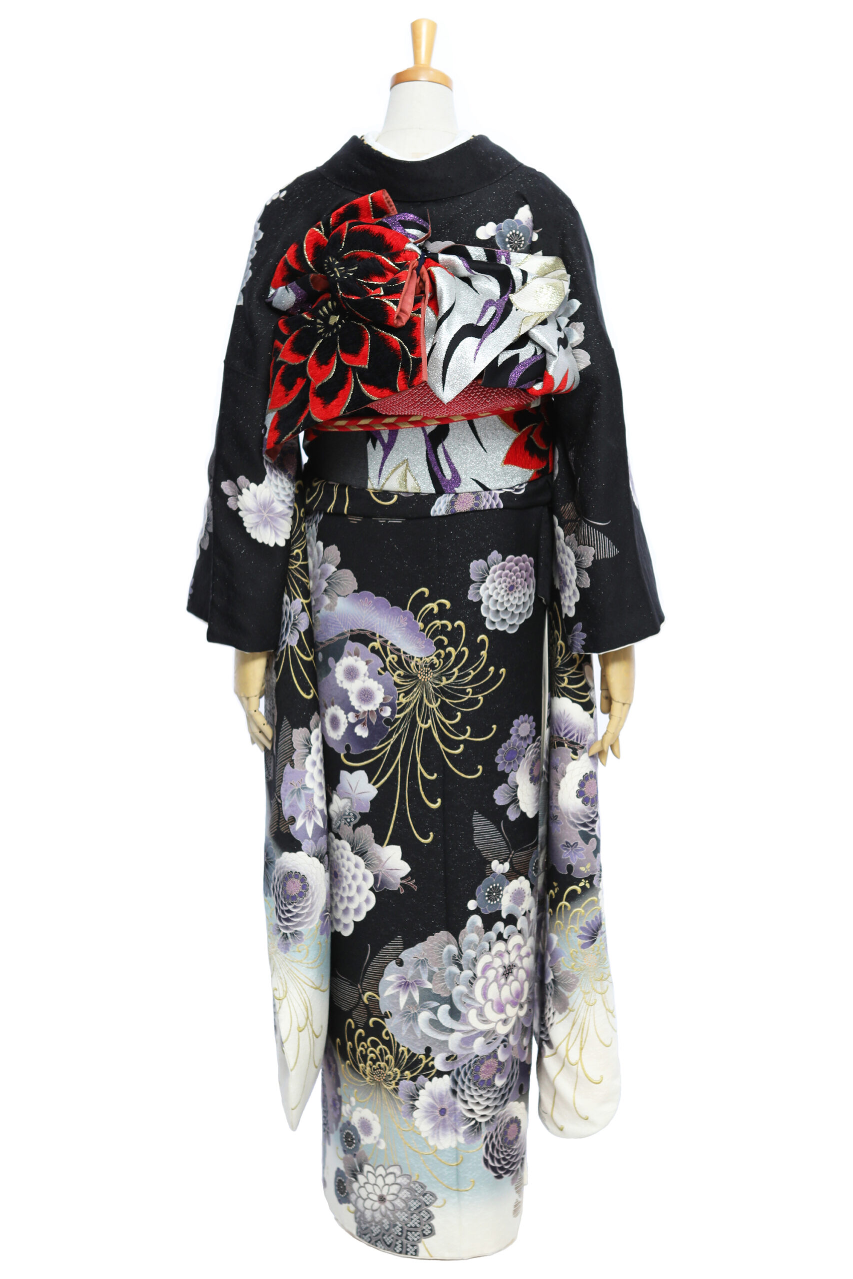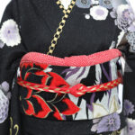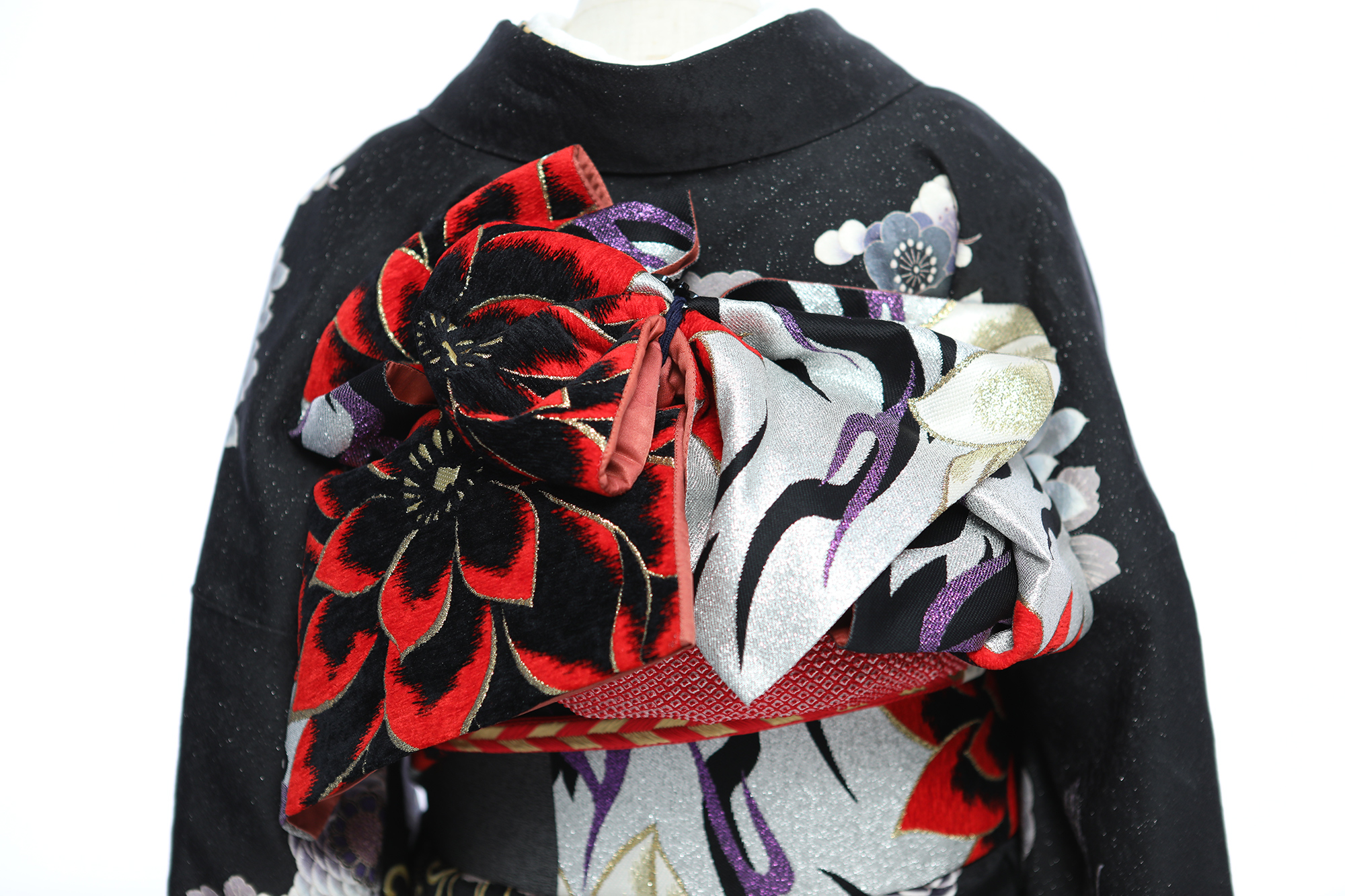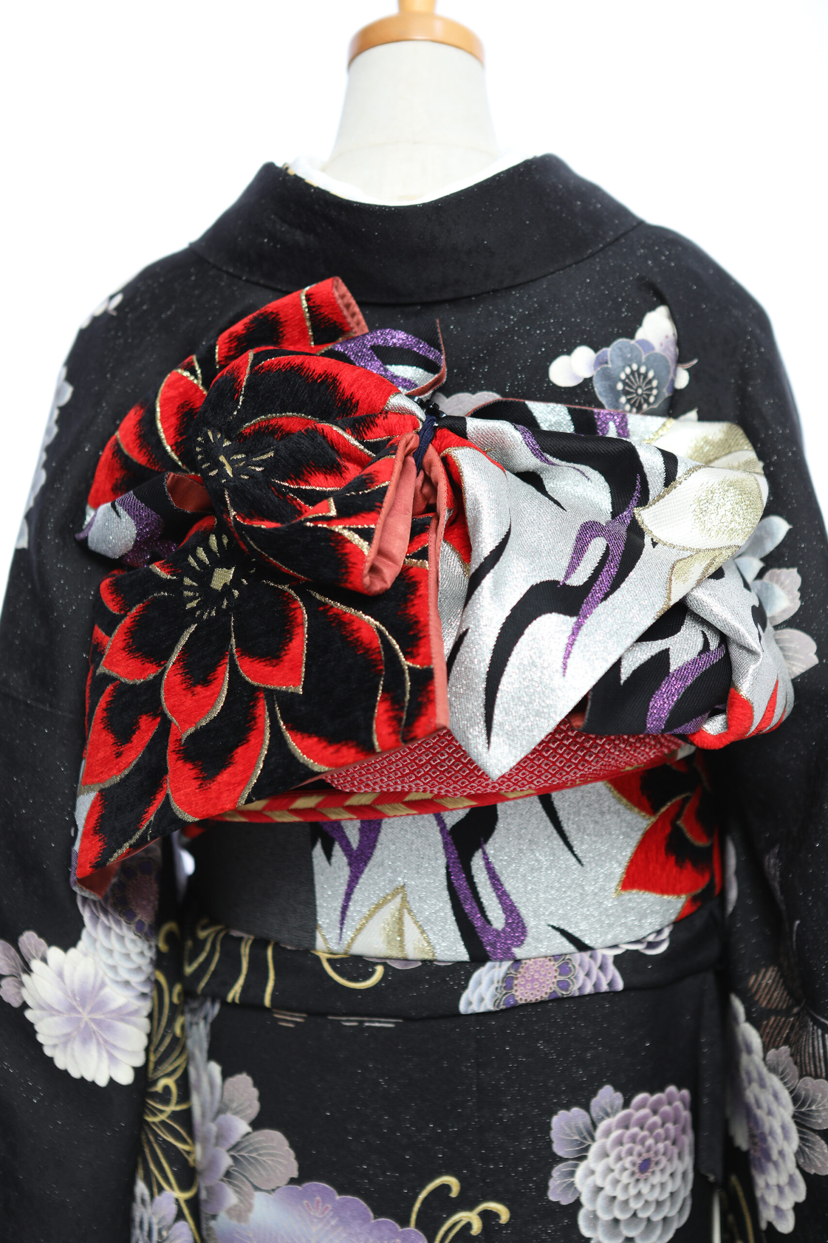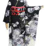 地色に銀糸を織り込み、シックな黒字もキラッと輝く振袖に仕上げています。