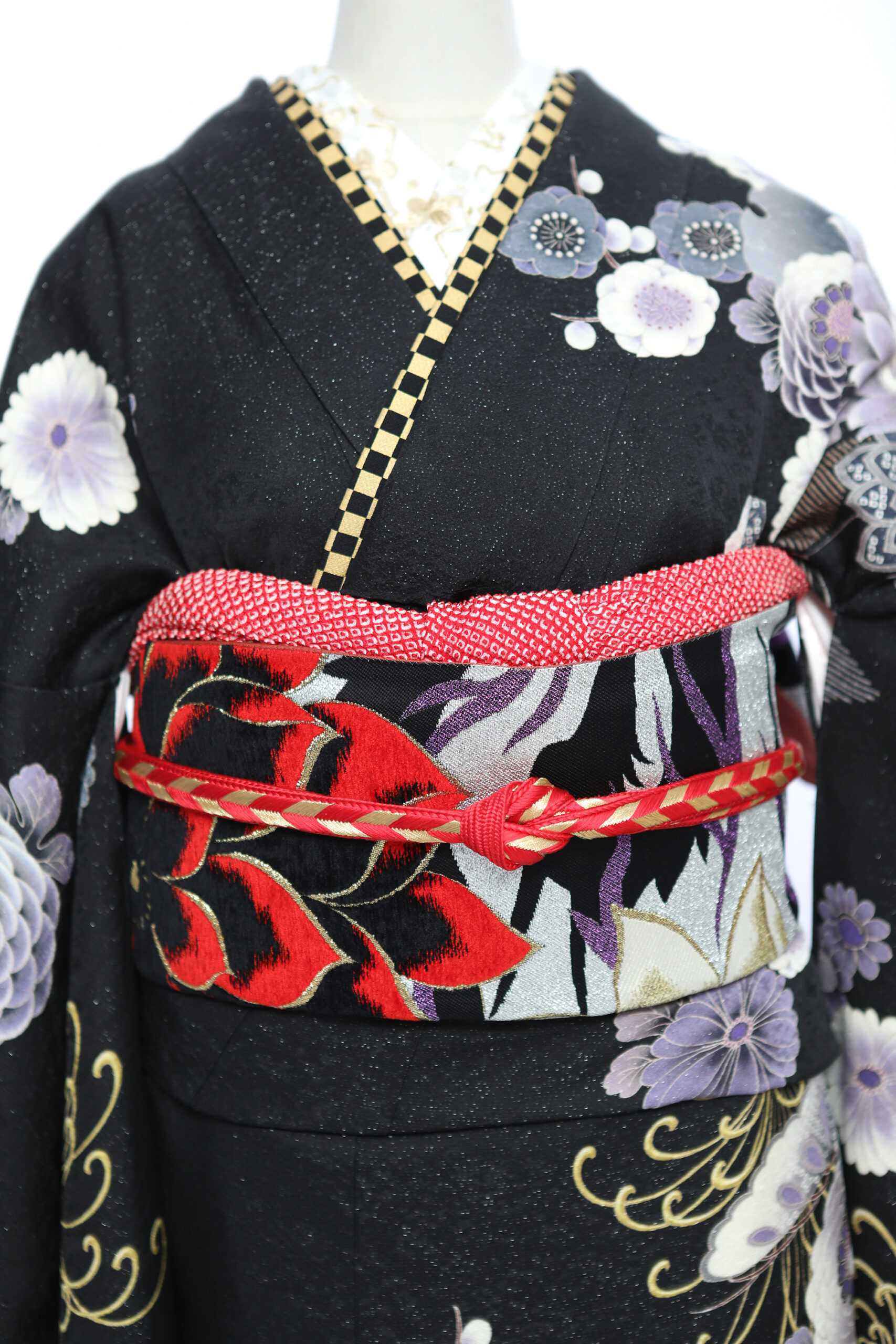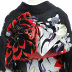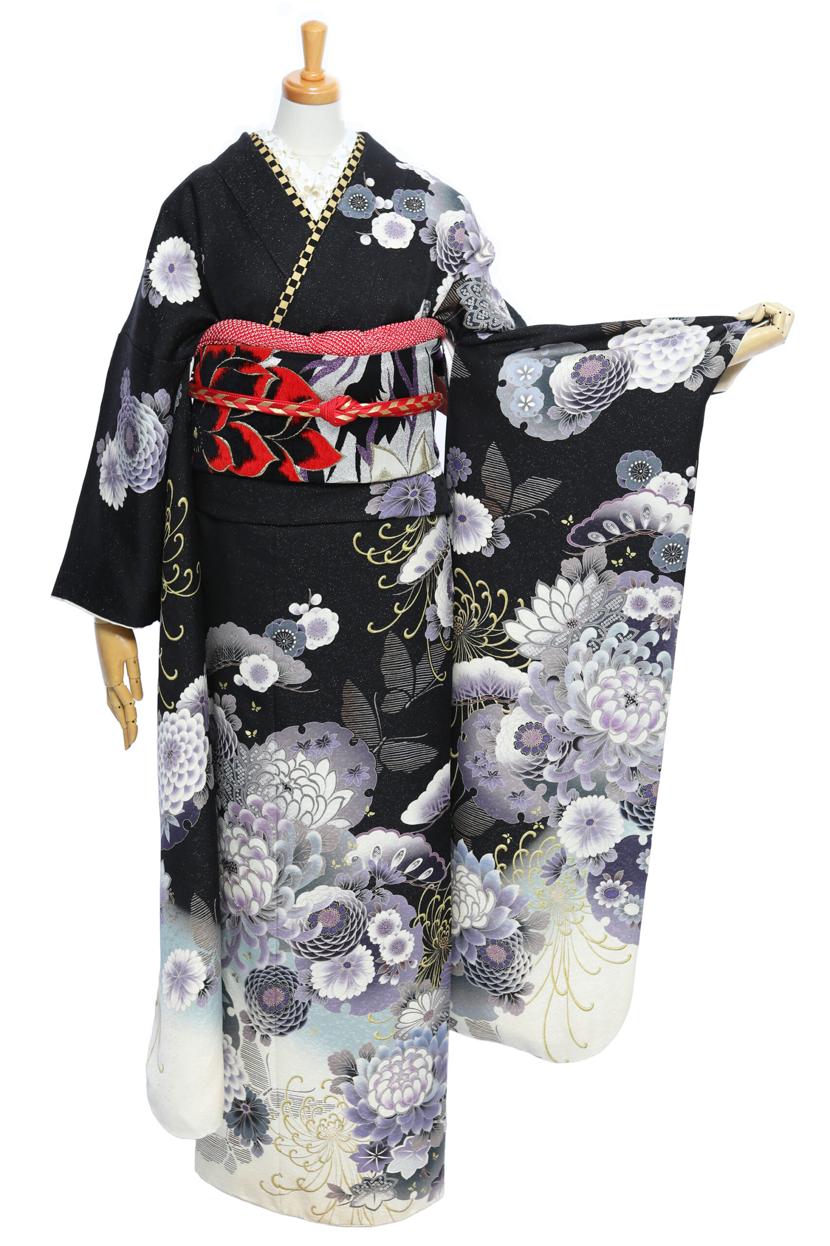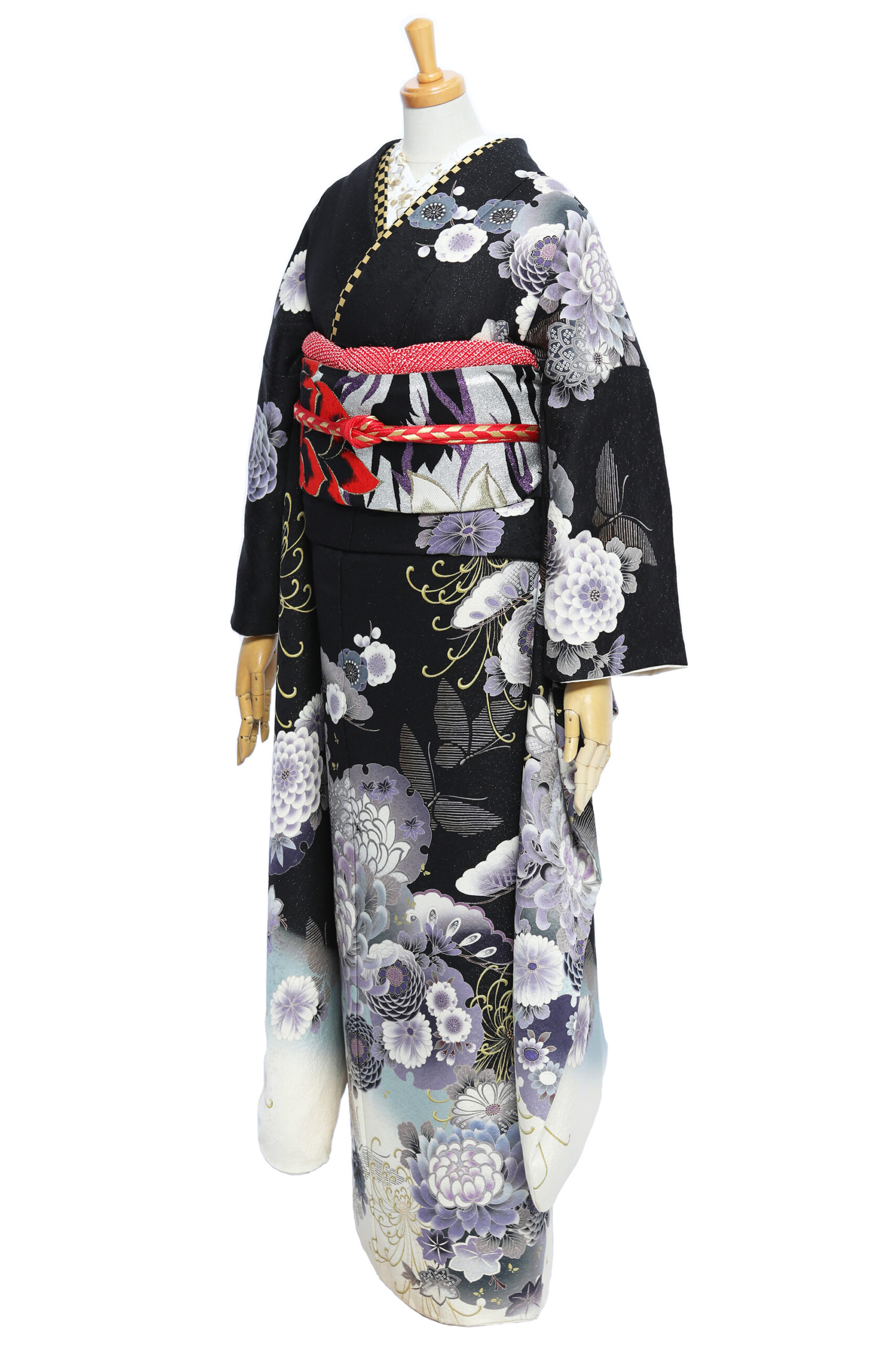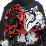 地色に銀糸を織り込み、シックな黒字もキラッと輝く振袖に仕上げています。
