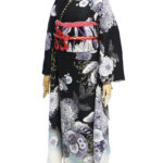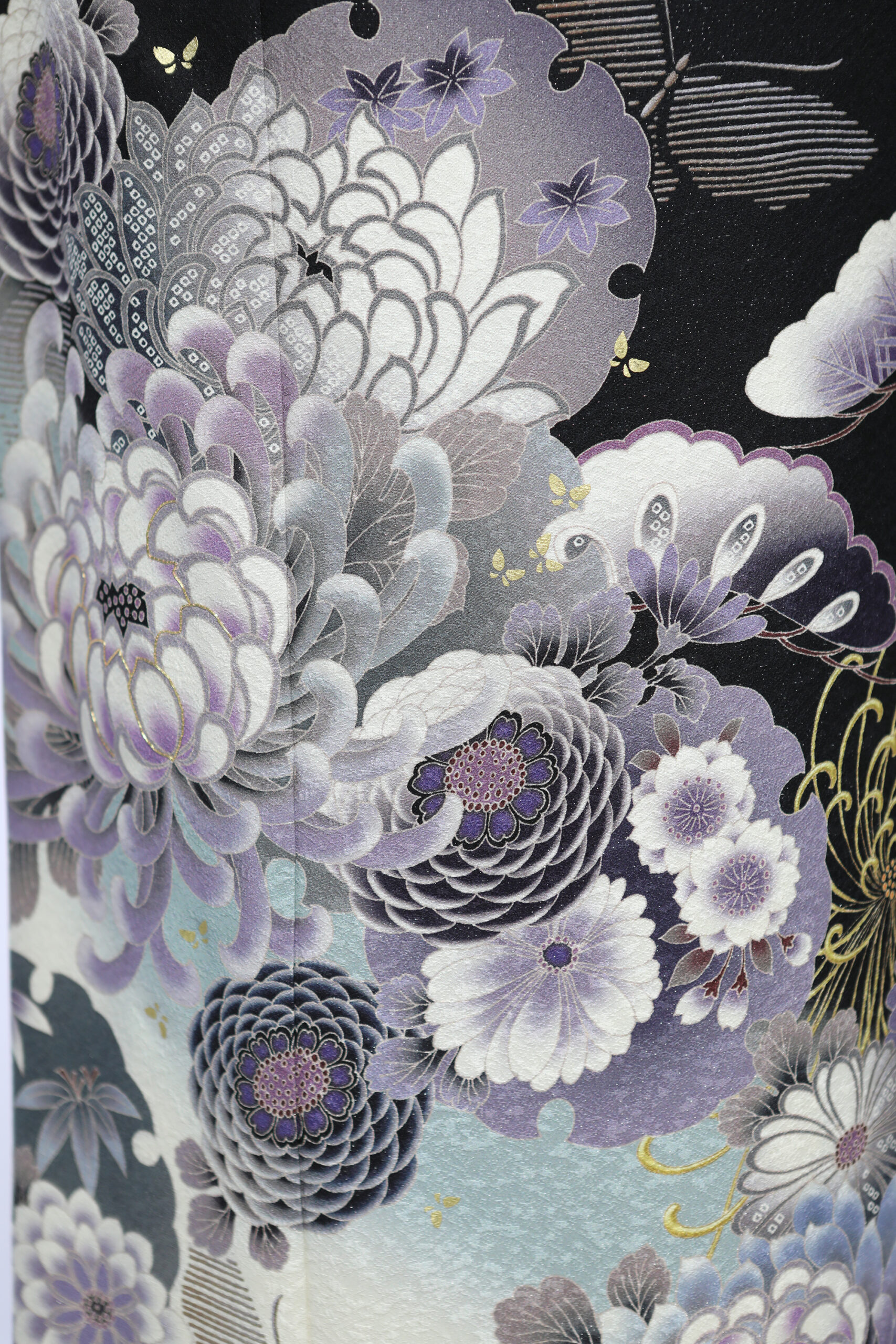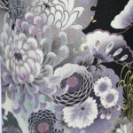 アッシュカラーの菊を中心に雪輪や蝶をあしらった陰影のある構成にし、モダンに仕上げました。