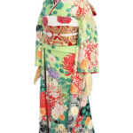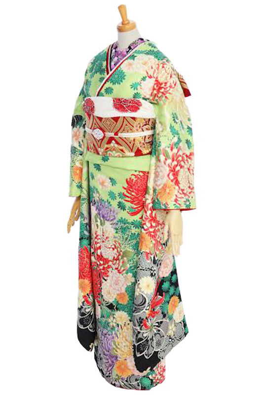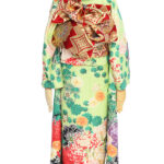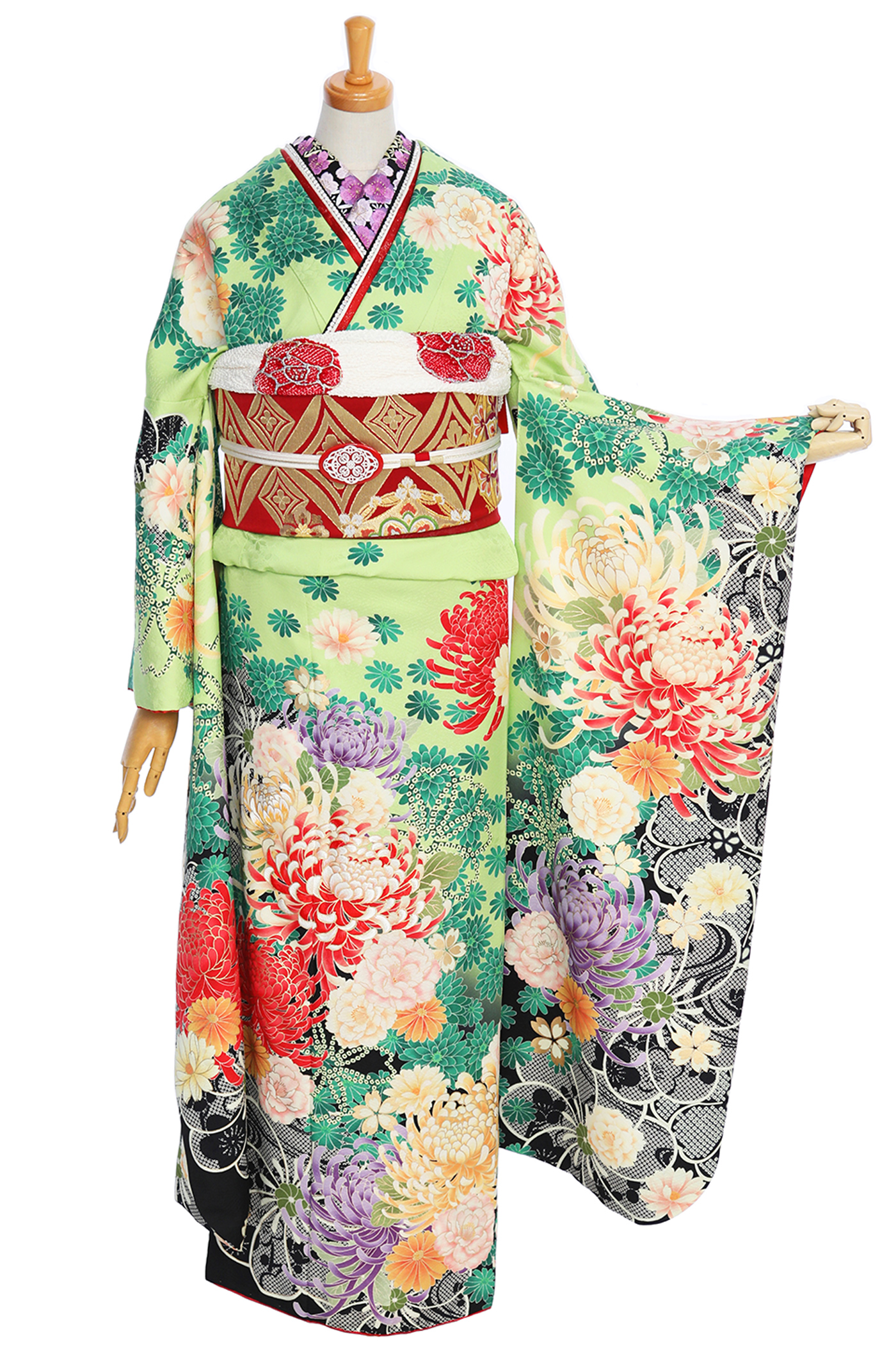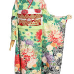 生き生きと満ちたピュアな緑地に、躍動感ある花々も一面に咲き誇る。華やかで洗練された豪華な一着。