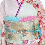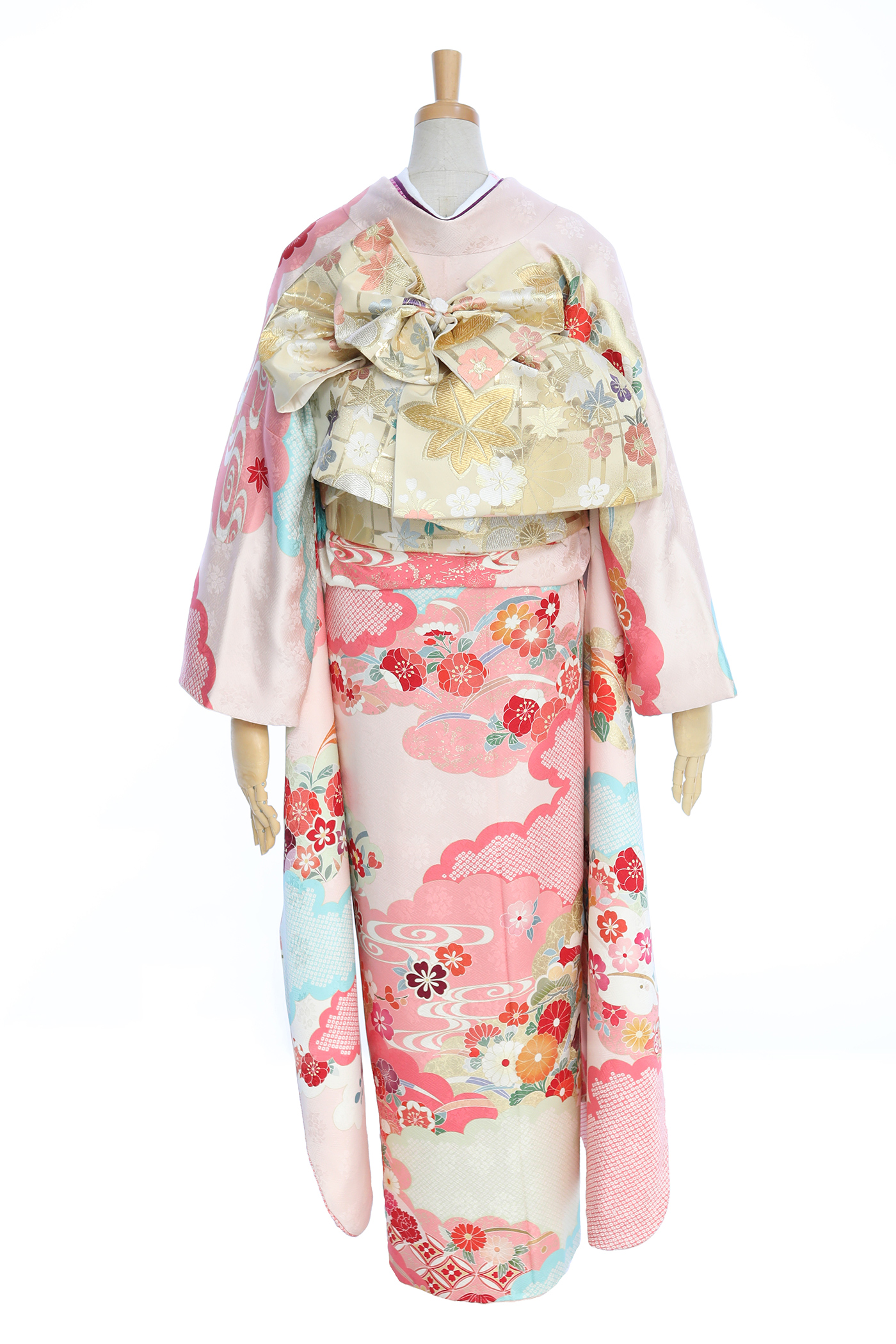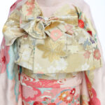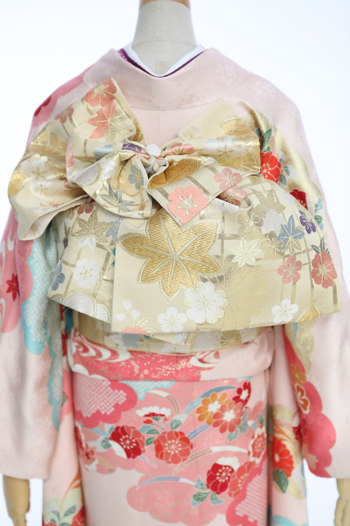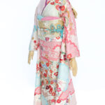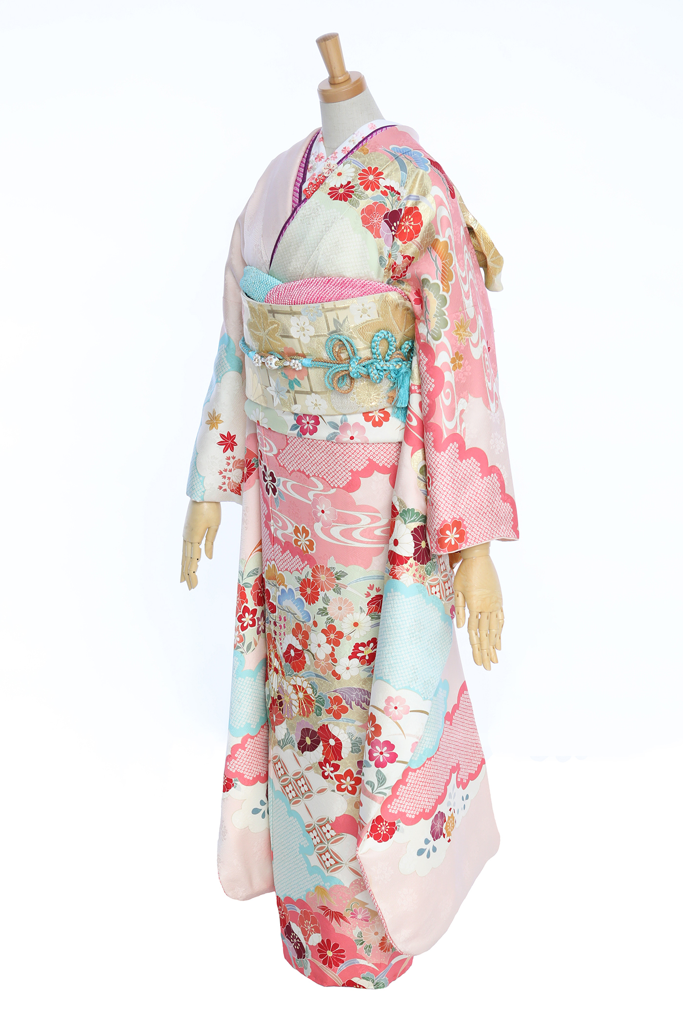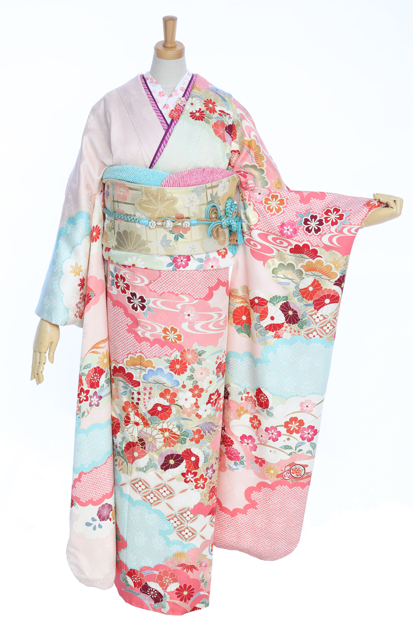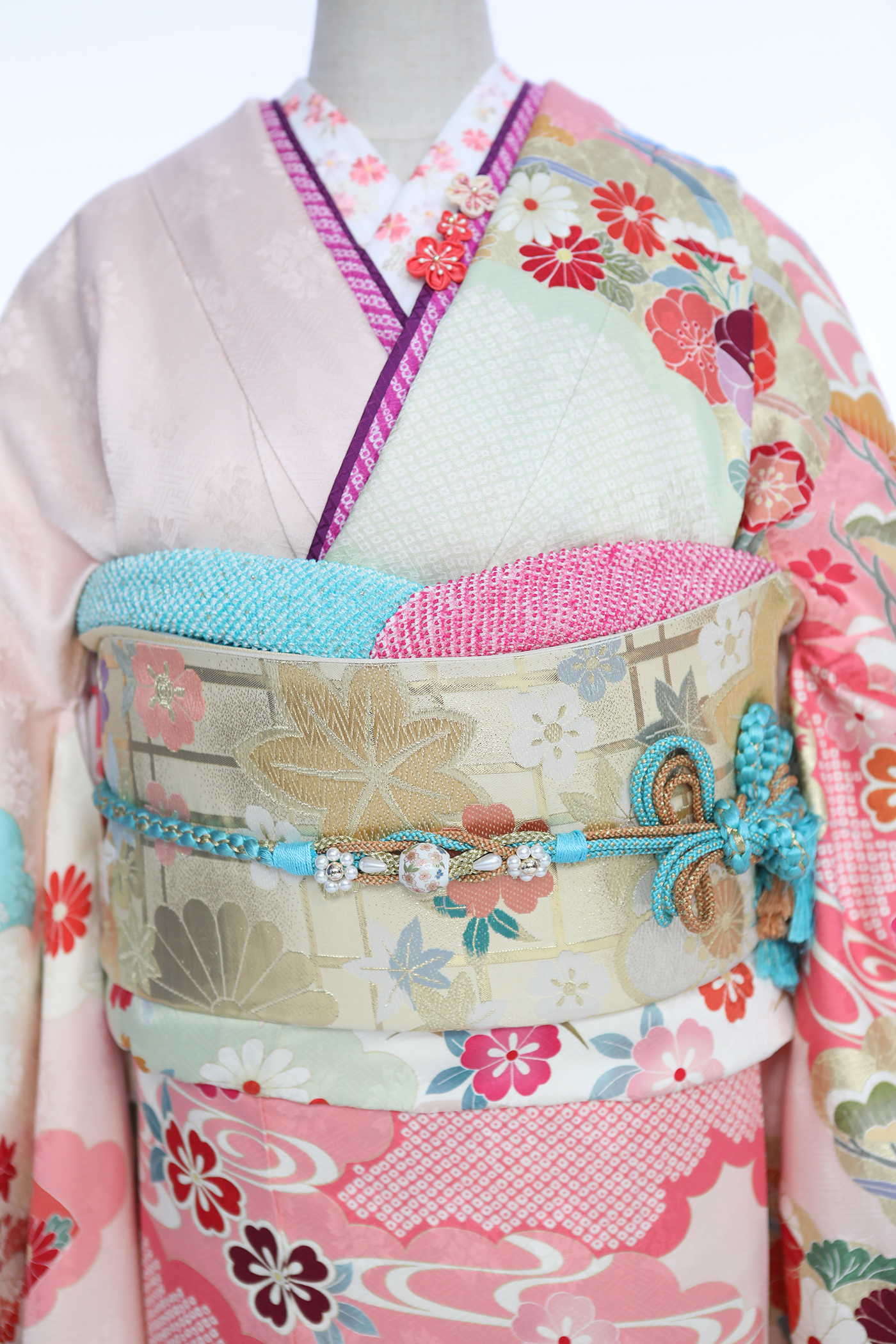 ブルーとピンク2色の鹿の子疋田で染め分け、桜、万寿菊、梅、松が立体的かつ華やかな印象を与えます。